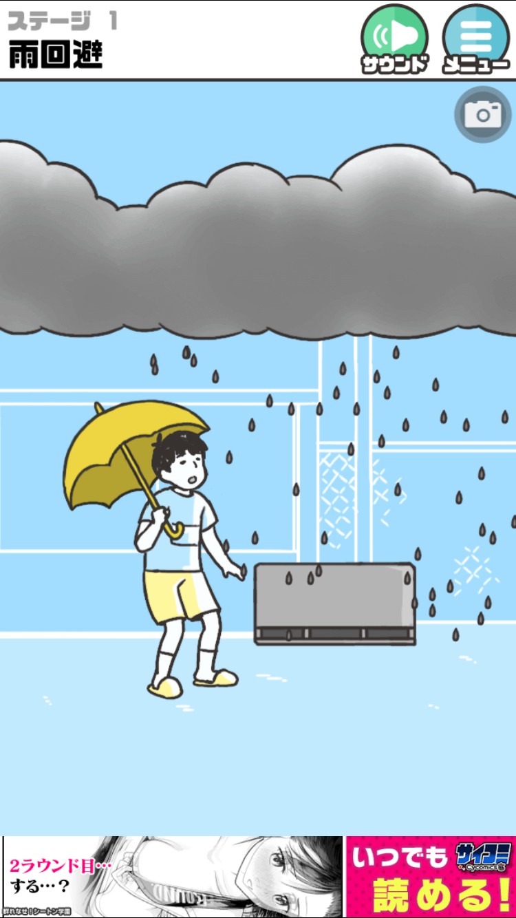 アプリを起動させると、漫画のようなイラストがたくさん書かれたステージが表示されます。プレイヤーは、男の子になって、いろいろな障害を回避していきます。例えば、初めのステージ。【雨回避】と出てきました。男の子の上に雨雲が発生、近づいてきます。ステージには、黄色い傘があります。男の子に持たせてあげましょう。すると、男の子は傘を開きます。案の定雨が降ってきましたが、傘をさしているので、雨を回避することができました。1ステージを終えて、このゲームの趣旨が分かったような気がしました。