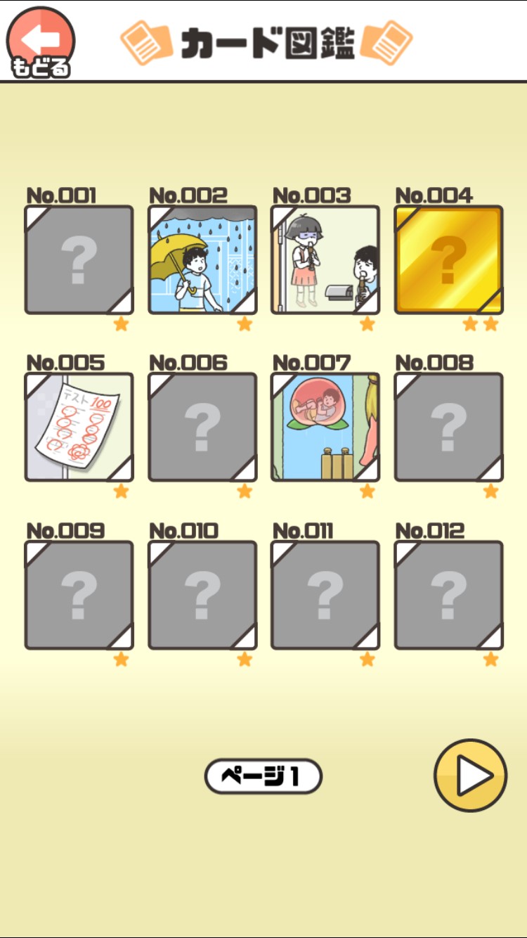 ゲーム中のひとコマをカード図鑑として収集することができます。上手く回避できた時、回避失敗の時、それぞれ自動でカードが収集されます。レア度が設定されていて、レア度が高いほど出にくいカードになっています。回避成功だけではなくて、あえていろいろな失敗バージョンにも挑戦してみましょう。