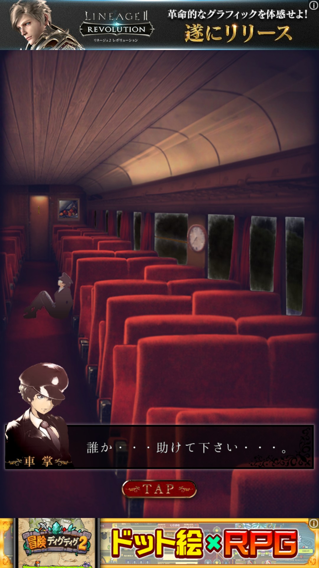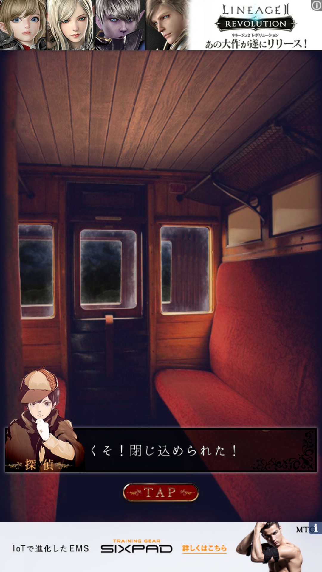 いや応なしに謎解きバトルに巻き込まれた探偵であるあなた。まずは閉じ込められた列車の客室からの脱出です。いろいろな所をタップして脱出に使えそうなアイテムを探してみましょう。
