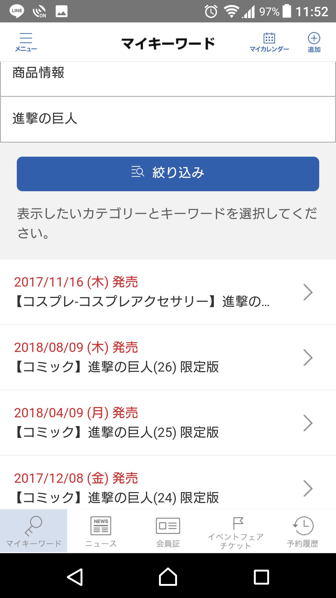 マイキーワードを設定すると、そのキーワードに関する情報が一日に一度通知されるようになります。発売日などの大事な情報を見逃すこともありません。