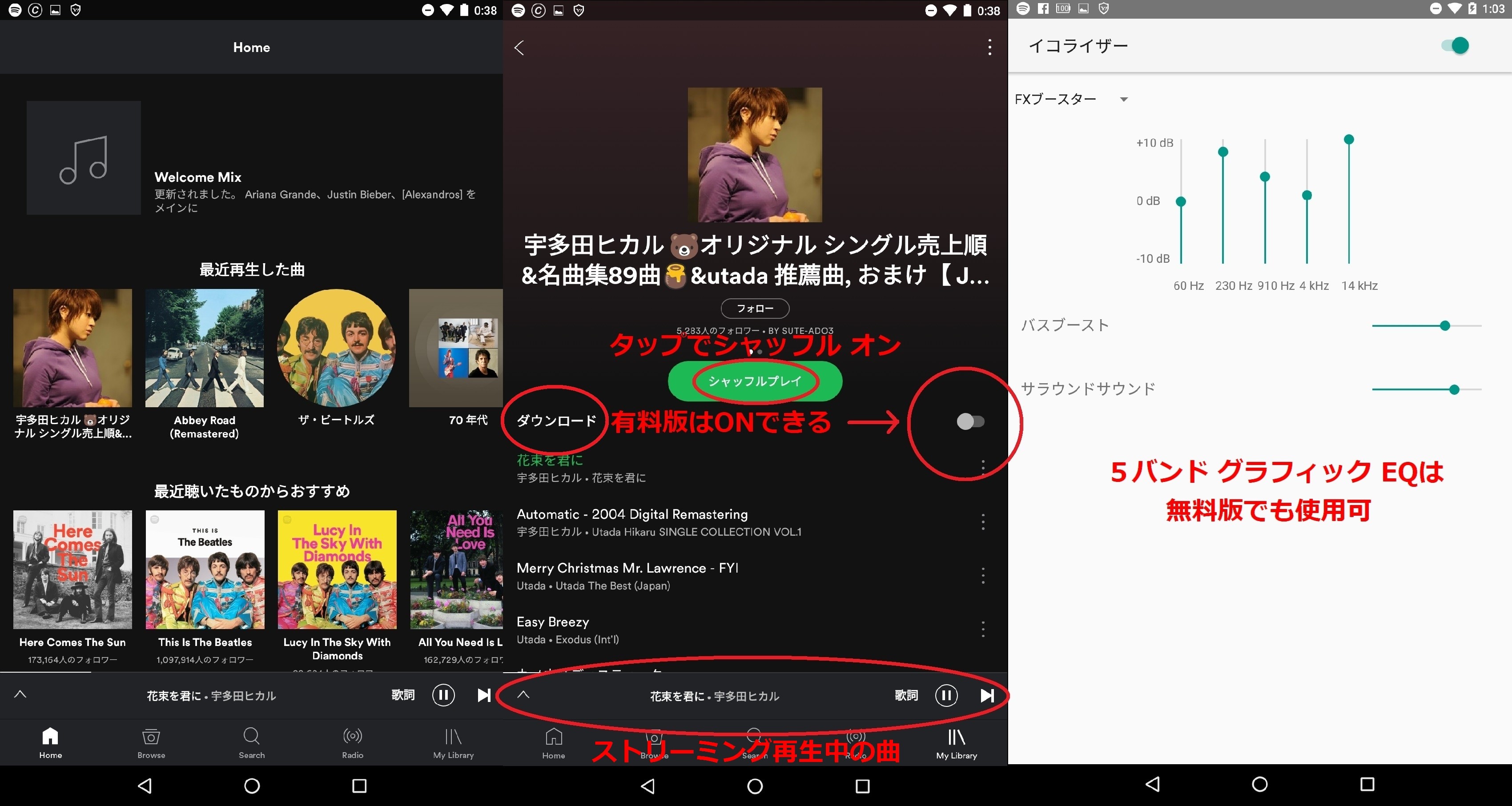 ただし無料版にはやはり制限があり、数曲おきに30秒程度のCMが入ること、音質が高音質(160kbps)までしか設定できないこと、ダウンロード保存ができないことがあげられます。