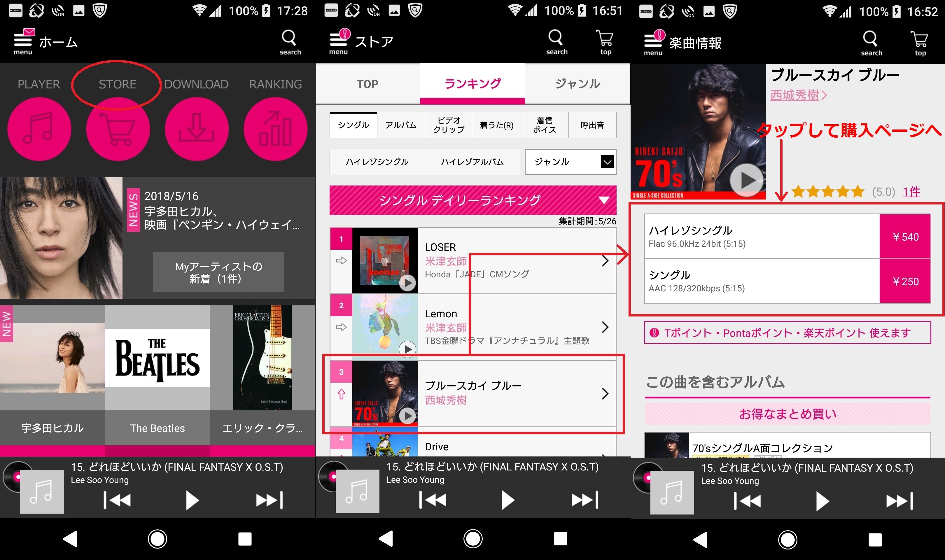 楽曲をダウンロード購入するには、ホーム画面で「ストア」アイコンをタップし、曲を選んで決済方法を選択します。
