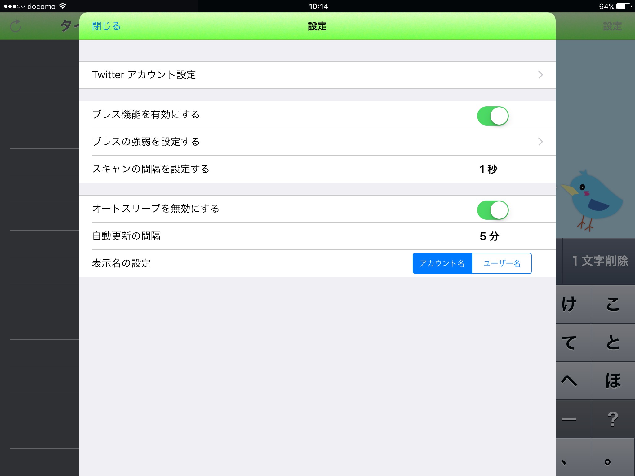 「息鳥」を実際に使うためには、まずtwitterアカウント開設が必要となります。twitterアカウントに必要事項をに入力して、「息鳥」の認証を行ってください。簡単な入力を終えたら、立ち上げた画面の左上にある設定で「ブレス機能を有効にする」をONにします。その他設定では、ブレス機能の強弱やスキャンの間隔も変更化のです。iPadのオートスリープを無効にする機能も便利ですね。アプリに戻ると、予め設定したスキャンの間隔スピードで、上から順にキーボード上をカーソルが動きだすので、入力したい文字の列で息を吹きかけます。次に、5文字ずつ点滅するのでまた、該当箇所で息を吹きかけます。言葉が完成したら、一列目の点滅に息を吹きかけ、「つぶやく」で投稿完了です。すぐに操作画面左側にあるタイムラインへ反映されます。