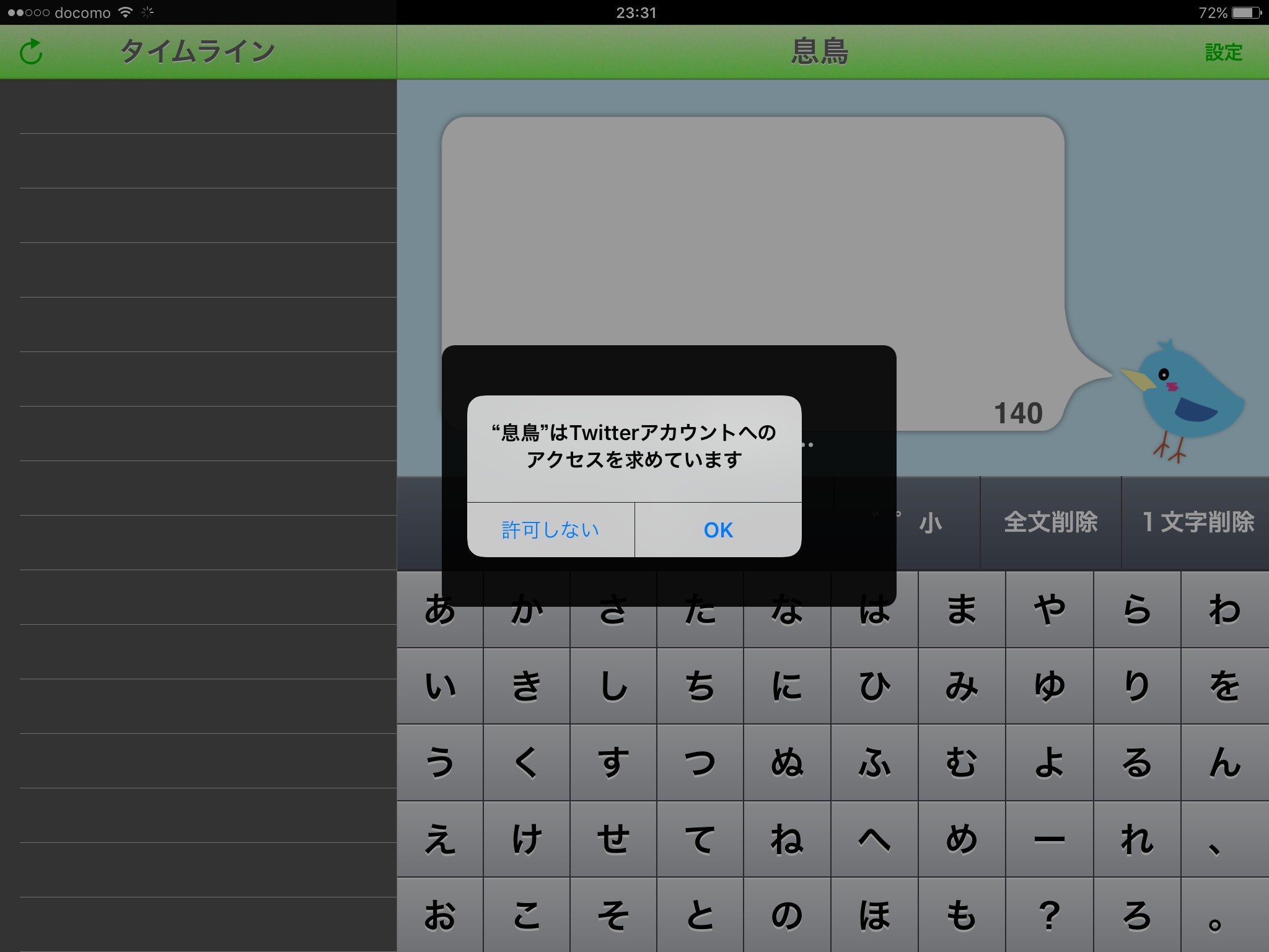 「息鳥」は、お使いのiPadにマイクを繋げて使用する、Twitterクライアントアプリです。キーボード画面上をカーソルが上下左右移動して、文字にカーソルが合ったタイミングでマイクに息を吹きかけると文字を入力できます。手指や言語に支障がある方も、本アプリを利用すると、Twitterの投稿や検索、閲覧を自分でできるようになりました。世界中の政治家もTwitterでつぶやくことが日常になった現代、あなたも自分の思いを、つぶやいてみませんか?