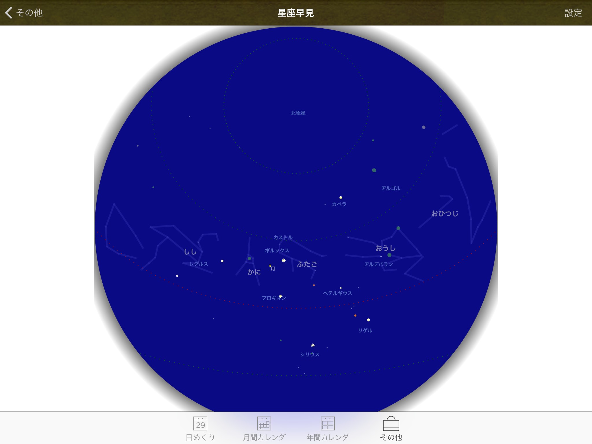 「日めくりHD」では、「日めくり」以外にも、月間、年間カレンダーやスケジュール機能のほか、星座早見表があるので使ってみてください。トップ画面下の「その他」にあります。星に興味があるお子さんが一人でも読めるように、ひらがなで星座名が記載されています。カレンダーや時間に大きく関係する星座早見表は、同じように見えて、毎夜、少しずつ変わる夜空の様子を時間ごとに観察したり、カレンダーを遡ったり進められるので、季節の夜空の違いを楽しみましょう。