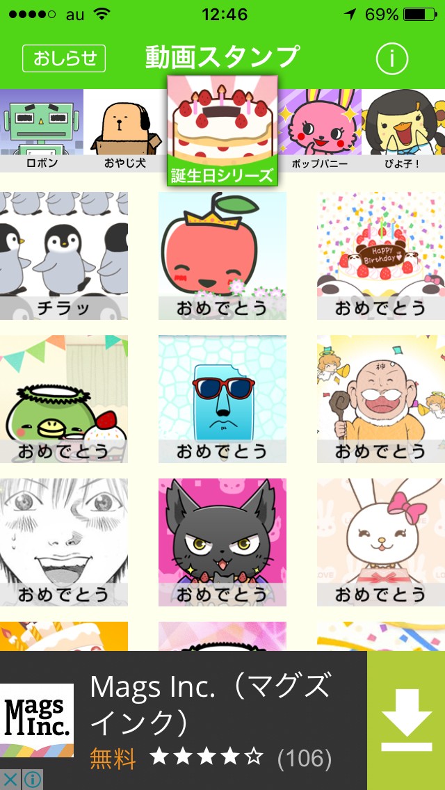 ・イラストのカテゴリは「まとりょおやじ」、「銀座のバラ」、「くまモン」、「アルオパカオ」など60種類以上あり、カテゴリ内に10種類以上のイラスト動画が用意されている