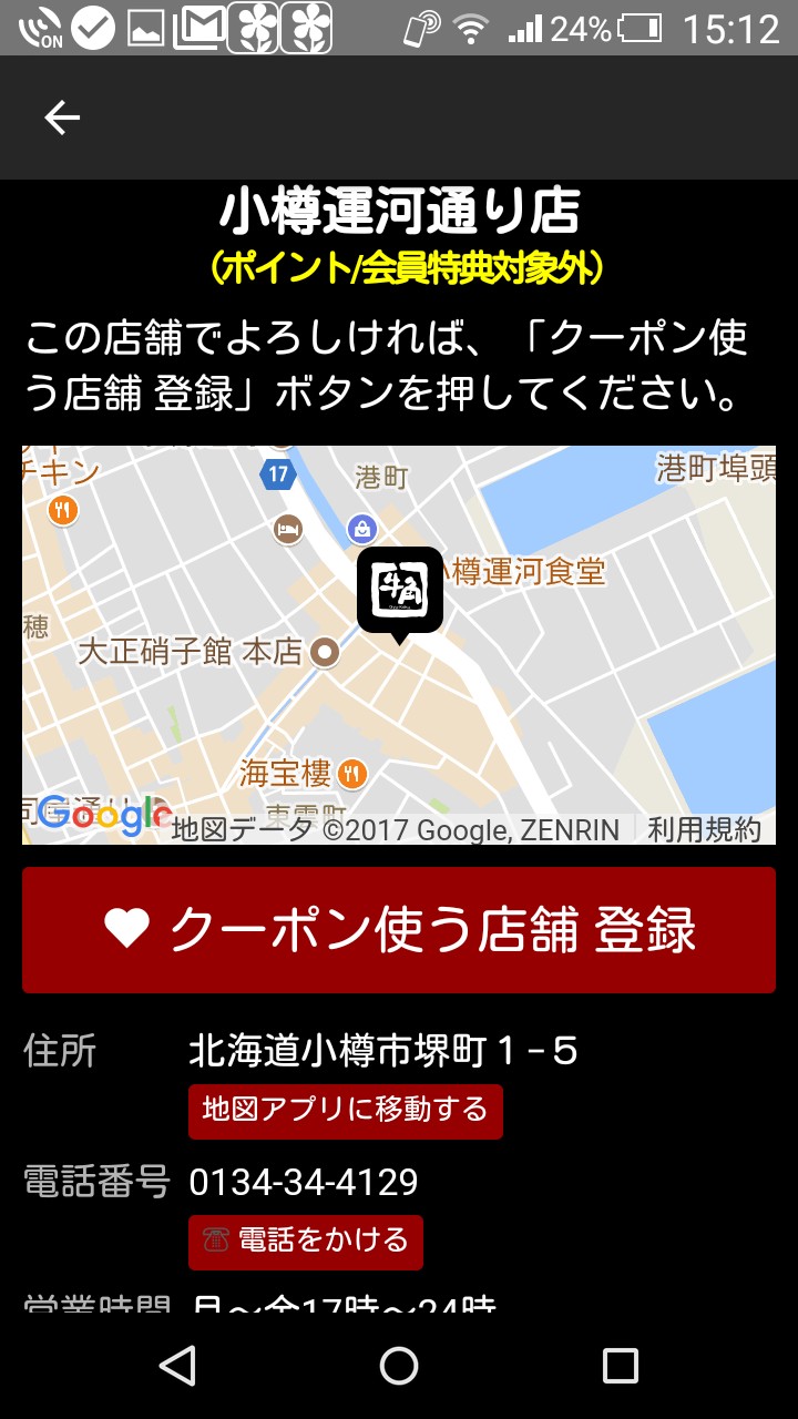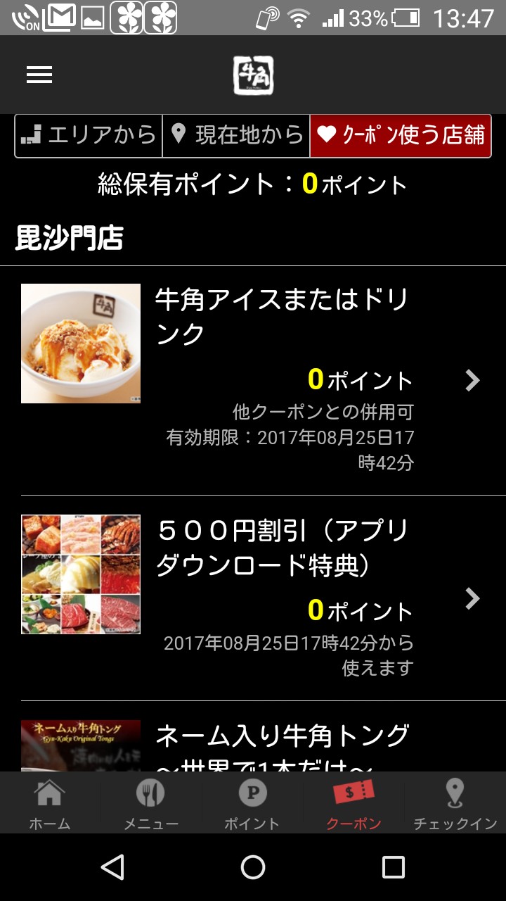 1.アプリをダウンロードしたら、近隣の牛角を選択して、クーポンを使う店舗に登録します。クーポンを使う店舗は、追加や変更ができます。ポイント対象外の店舗もありますが、クーポンは全店あります。