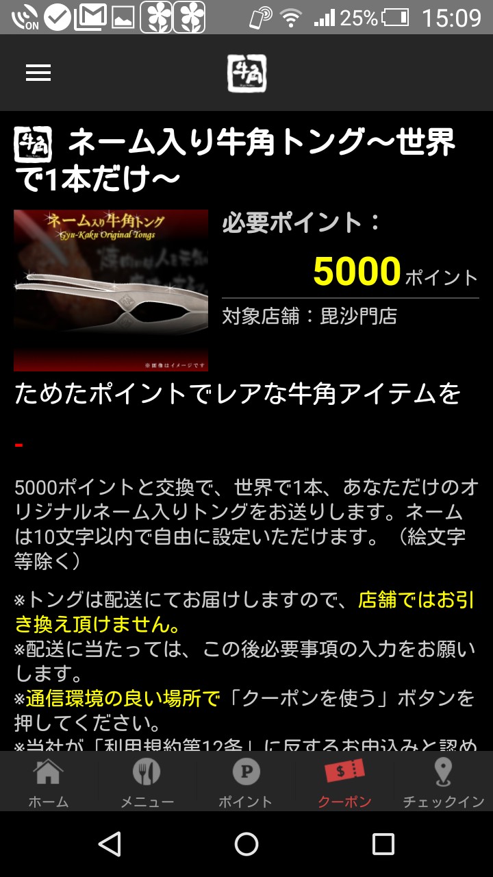 「クーポンを使う店舗」を登録すると、その店舗で使える優待券がスマホ上でもらえます。ポイントが無くても使える500円割引券や牛角アイス券の他、1000ポイントためると使える1,000円割引優待券などがあります。更に、5000ポイントためると、先がテーブルに付かない、あのスタイリッシュで便利な牛角トングに名前を入れたものをもらうことができます!クーポンは店舗によって違うので、通える範囲に複数の牛角がある場合は、使いたいクーポンがある店舗を探してみてもいいですね。