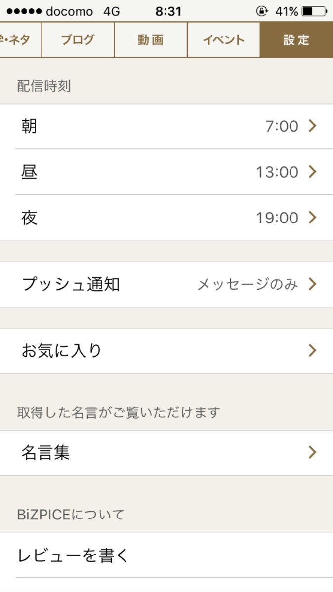 カテゴリーの一番右には「設定」ボタンがあります。設定では配信時刻の変更やアプリ取得日からの名言集を確認できますよ!ぜひ設定もチェックしてみてくださいね。