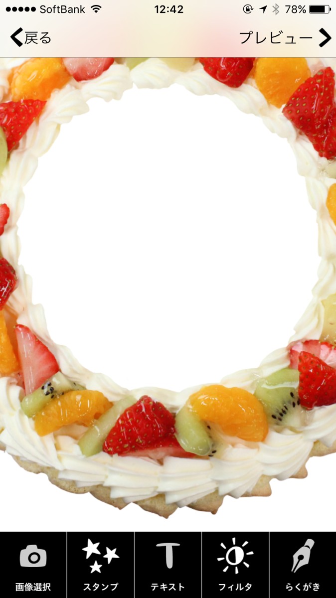 今回は生クリームケーキを選びます。「画像選択」をタップして、写真を撮るかカメラロールから画像を指定しましょう。ケーキの上に画像が表示されるので、スワイプ・スライドしながら配置を決めます。画像が配置できたら、デコレーション開始です。スタンプやテキスト、らくがきだけでなく、画像加工アプリのようにフィルタ掛けもできます。