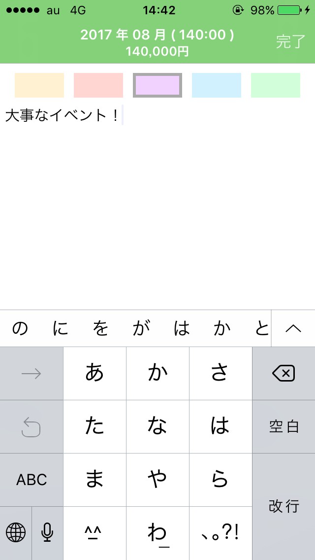 イベントなどのメモを記入する際は日にちを選択して「memo」をタップするだけです。上部に5種類の色があるので、選択して色分けをします。