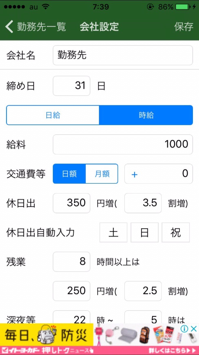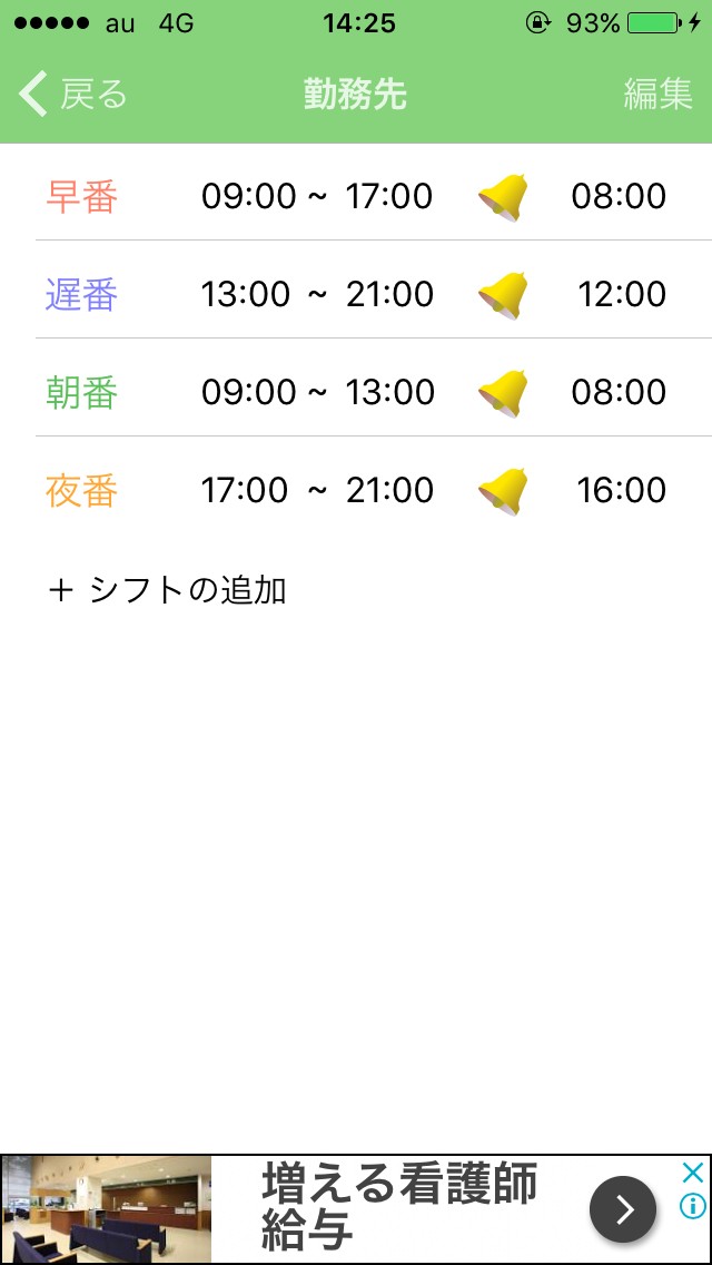 右上の「編集」では勤務先の設定で時給などの給料設定ができ、勤務先のシフト設定では勤務時間などのシフトを設定することができます。