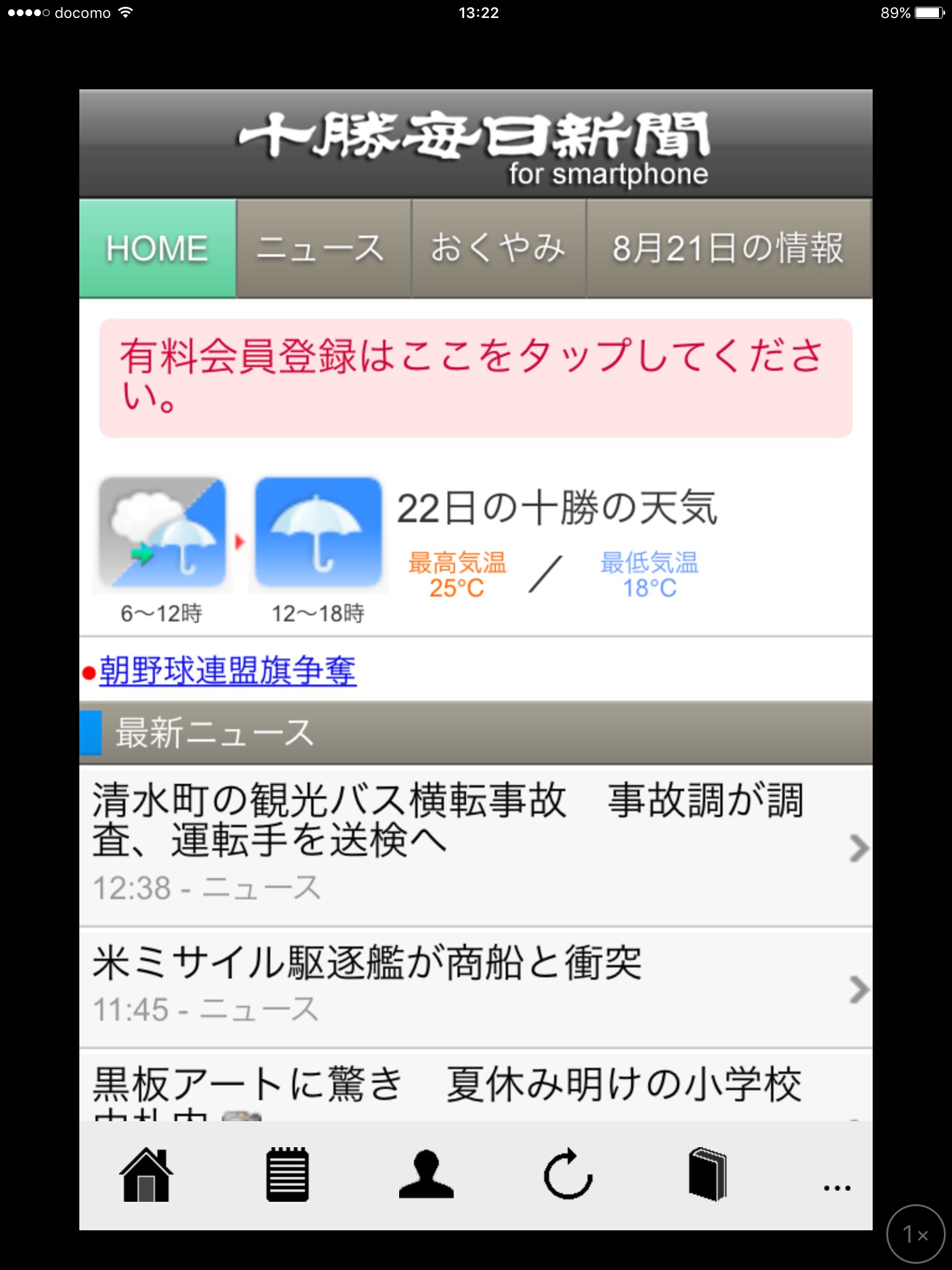 「十勝毎日新聞 for smartphone」では、無料での北海道内の天気と時事ニュースの見出しの閲覧は可能です。より詳しい内容を知りたい方やアプリで仕事中に一気に読んでしましたい方には登録をおすすめします。