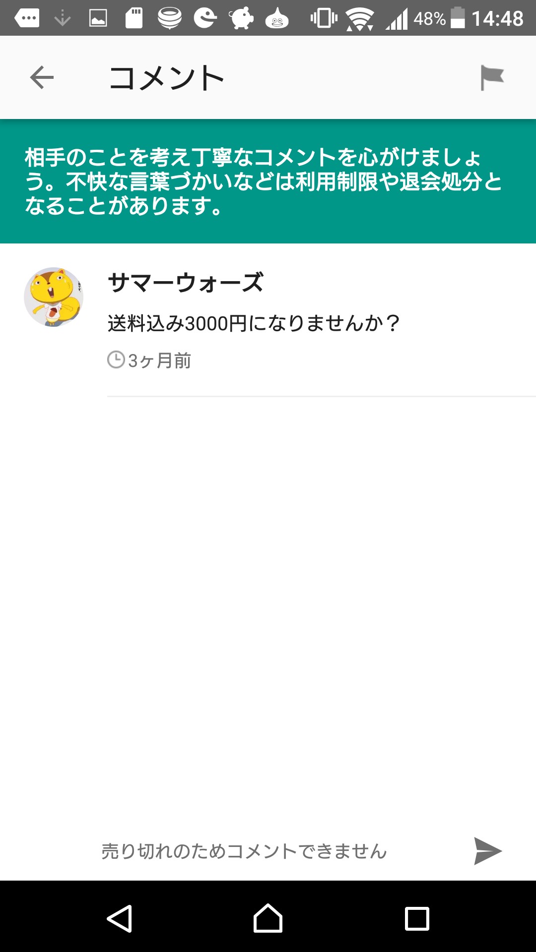 金額提示不可とされているにも関わらず、○○円まで値下げして欲しいなどというメッセージを送ることは厳禁です。
