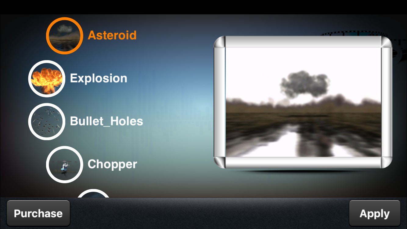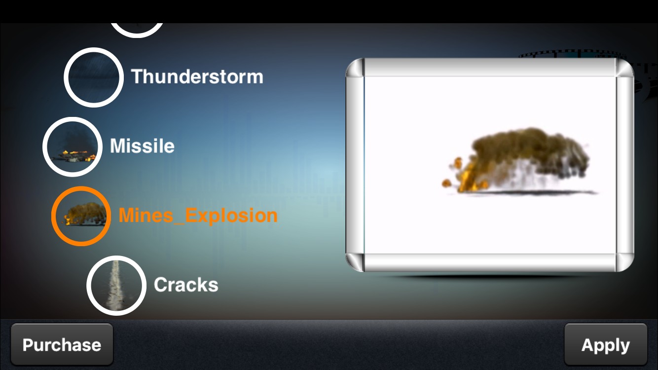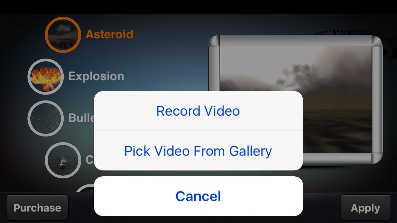 お好みの動画に合成できる動画は、全部で8種類あります。そのうち、無料で使えるのは、弾道ミサイルが被写体に直撃する動画、突然、地面からキノコ雲が立ち上げる爆弾の動画、そして、どこからともなく銃弾が乱れ飛ぶ動画の3種類です。この3種類だけでも、十分に楽しめるかもしれません。例えば、被写体めがけて、爆弾を落としたり、銃弾を打ち込んだり、木っ端微塵に爆発させたりと、イタズラ動画を簡単に作れてしまいます。さらに、有料版では、上空からヘリコプターが飛んできたり、突然雷が落ちたり、爆弾が飛んできて戦車が爆発したり、凄まじい連射爆弾が落ちたり、地面が二つに割れたりと、なんでもありの動画が、自分がとった動画や、既にライブラリに保管されている動画と簡単に重ね合わせることが出来るのです。