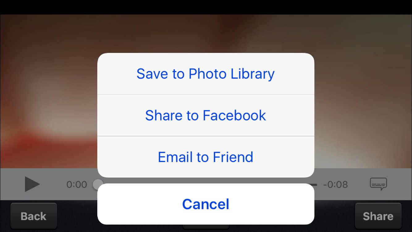 作成した動画は、そのままFaceBookでシェアできます。まずは、重ね合せる動画を8種類の中から選びましょう。そのあと、動画を撮影するか、ライブラリに保管されている動画ファイルを選びます。その次のステップでは、画面の上に表示されたサムネイルから、爆弾を落としたり、弾丸を打ち込み最適なフレームを選択すれば、組み合わせ動画の生成が始まります。しばらくすると動画再生画面が表示されますので、ここで、Shareのボタンを押すだけ。これだけの操作で、面白おかしい動画ファイルが、FaceBookにシェアできてしまいます。FaceBookにシェアする以外にも、メールに添付して友達に送ったり、もちろん、フォトライブラリに動画を保管することも可能です。どんどん、おもしろ動画を作って、フォトライブラリに保管して、パーティーやイベントなどで、みんなと楽しんじゃいましょう!