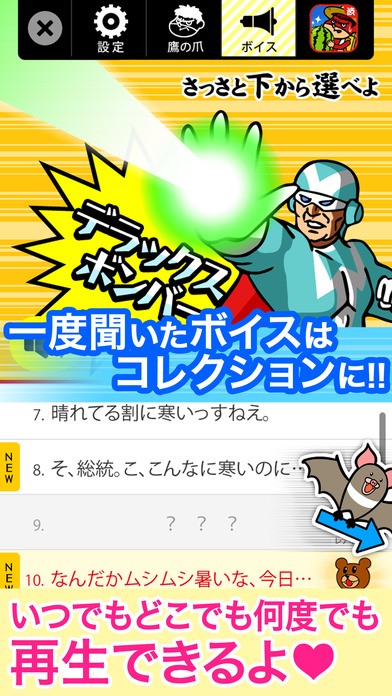 みなさんは仕事や学校、子育てなどなど忙しい日々を送っていらっしゃるでしょう。この「おしゃべり天気 ~鷹の爪団が雨も雪も台風もゆるく予報」はそんなストレス社会を生きる皆様におすすめしたいアプリなのです。天気予報という日常に欠かせない情報を得ながら、癒しも感じることができるそんなアプリを使ってそんな生活に癒しの時間を作っていただきたいと思います。