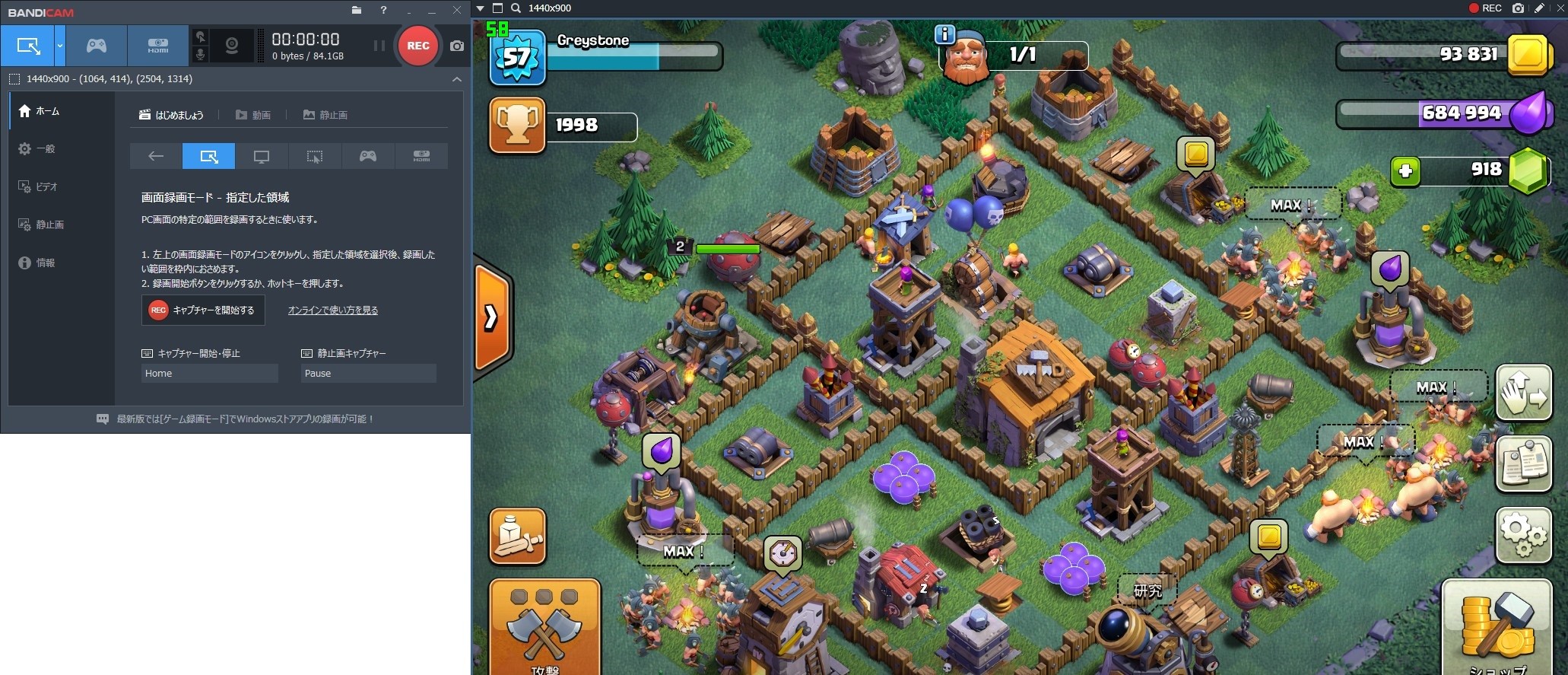 基本的にこれだけで出力された画面を録画することができますが、万一うまく動作しない場合はBandicamを画面録画モードに切り替えて手動で録画範囲を設定してください。手動で設定するとこの画像のようにゲーム画面の上部に1440x900のような解像度表示と録画ボタンなどが表示されたバーが表示されます。