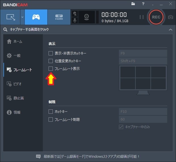 この画像ではフレームレートが表示されていますが邪魔な場合は消すことができます。Bandicamのフレームレートタブにあるフレームレート表示のチェックを外してください。