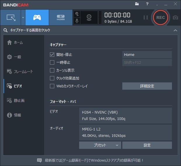 PCに画面を出力させればあとは微調整して録画するだけです。PCで動画キャプチャソフト(画像はBandicam)を起動して画質・音質などを設定します。これでReflector 2の画面をクリックし、キャプチャボタンをクリックするだけで録画を開始してくれる状態になります。フォーマットも設定できますので編集したい場合は編集しやすいフォーマットを選んでください。