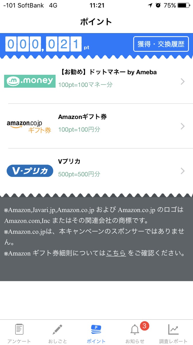 「アンケートで貯まる!スマートアンサー」は、数のノルマや時間の縛りなどもなく、自分の生活に合わせて自由に回答できます。問題数は5問以内のものが多く、内容も選択式で自分に当てはまるものを短時間で簡単に回答できるので苦になりません。獲得できるポイント数は、1つのアンケートにつき2~3ポイントのものが多く、ポイントの保持数はアンケート一覧表示画面で常に確認できます。貯まったポイントは特典によって100ポイントから、もしくは500ポイントから交換ができるものがあり、【お勧め】ドットマネーbyAmeba、Amazonギフト券、Vプリカで現金として使用可能です。景品ではなく現金同様にネットで買い物できるところが嬉しい点です。「アンケートで貯まる!スマートアンサー」でポイントを貯め、自分へのご褒美に好きなものを買っちゃいましょう!