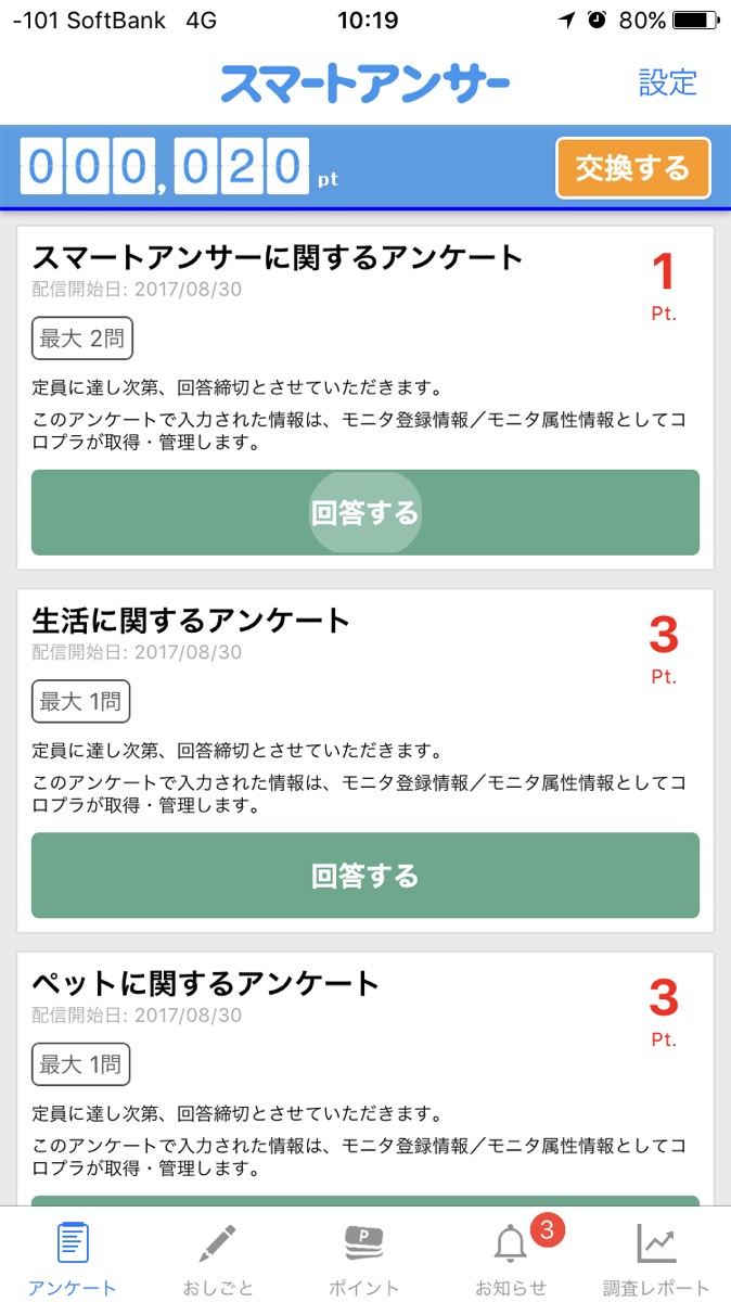 3.一覧表示の中からアンケートの内容・問題数・もらえるポイント数を確認します。