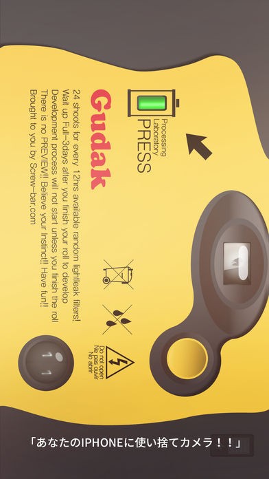 「Gudak Cam」は、古いインスタントカメラのようなレトロな写真を撮ることができる120円のアプリです。「Gudak Cam」はインスタントカメラをそのままiPhoneに取り込んだようなアプリで、1本のフィルムで24枚の写真を撮影することができ、24枚を撮り終わると、その3日後に写真を保存できるという仕組みになっています。また1本のフィルムを撮り終わると、その1時間後に新しいフィルムと取り換えることができ、フィルムには本数制限もありません。