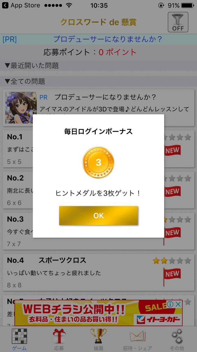 3、毎日ログインボーナスでヒントメダルを3枚もらえる