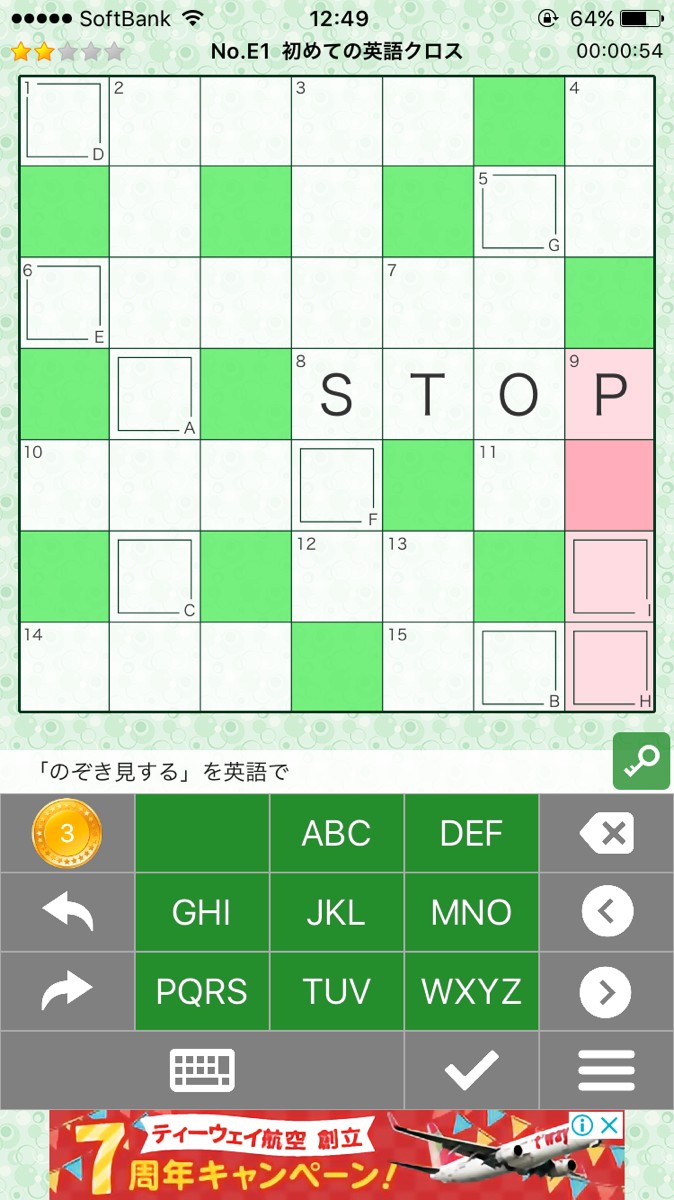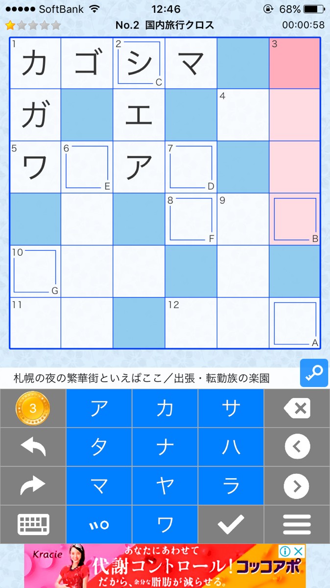 マスを選択すると画面下の選択中のカギが表示されるので、カギの答えを入力していきましょう。