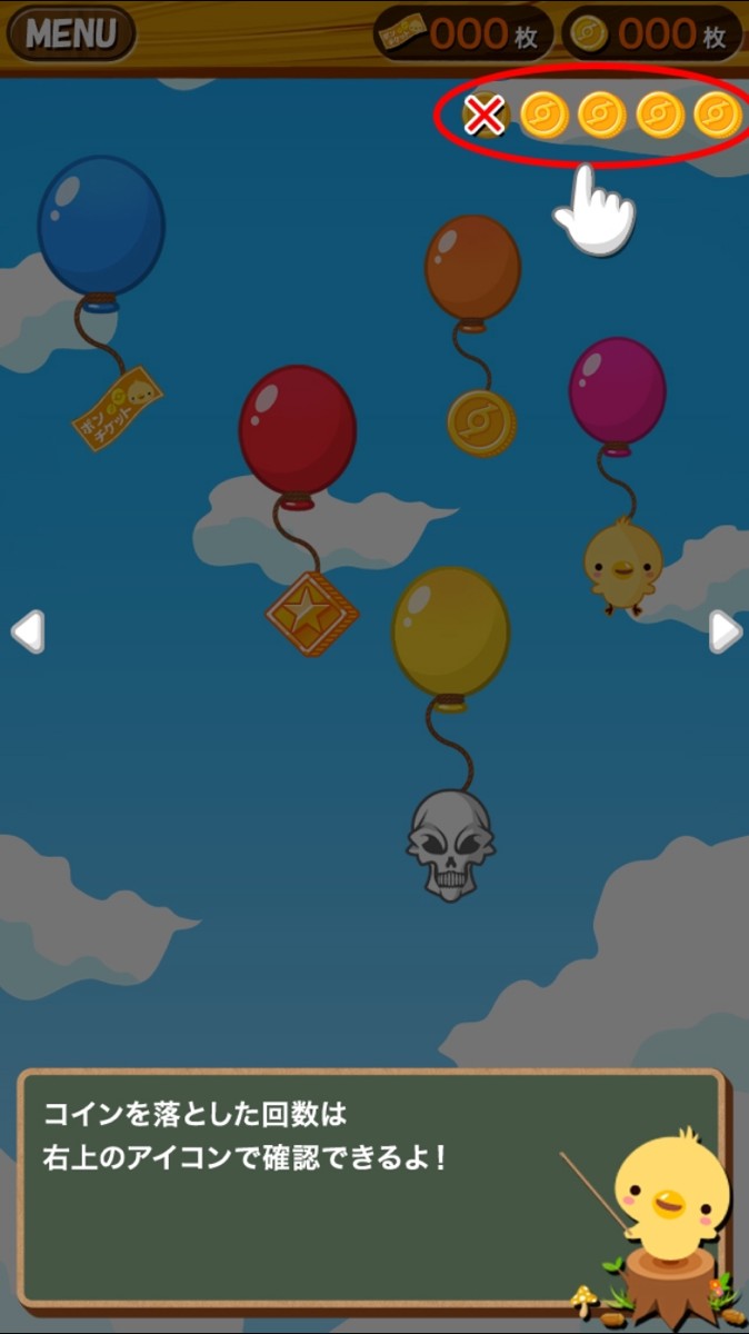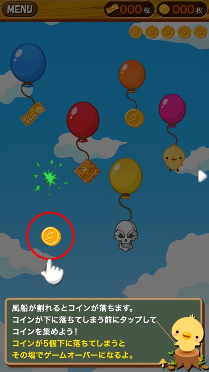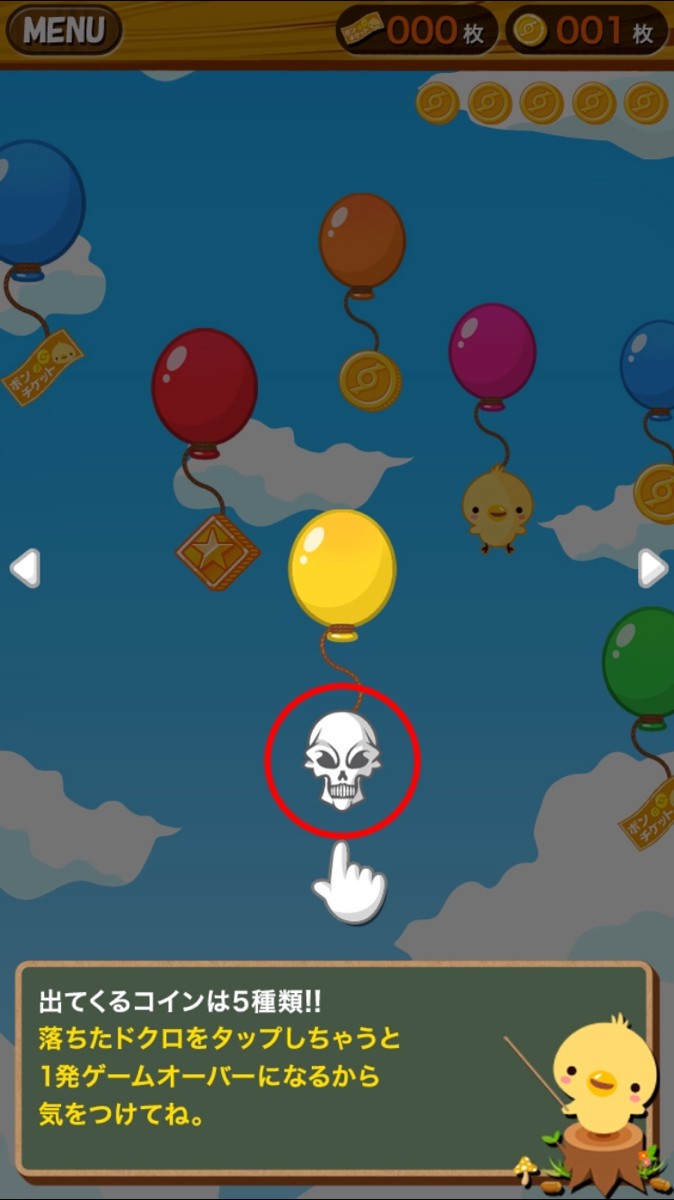 3.ゲームが始まるとコインやドクロが付いた風船が流れてきます。風船はランダムに割れるので注意しましょう。コインが下に落ちる前に拾います。5回取り損ねるとゲームオーバーです。なお、ドクロを拾うと1回でゲームオーバーになってしまいます。たまに出てくるヒヨコを拾うとボーナスステージになるので、取り逃さないようにしましょう。