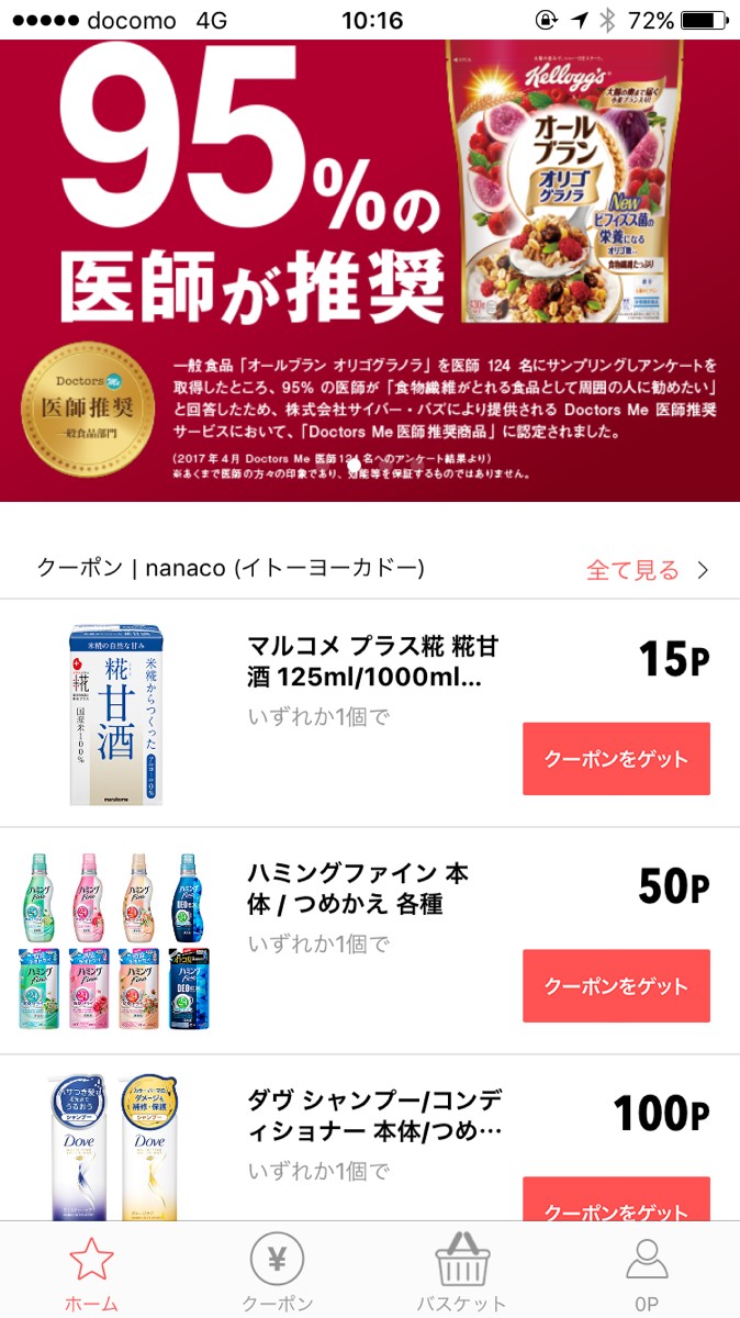 ホーム画面に戻り、クーポン対象商品をスライドして確認します。気になる商品があれば「クーポンをゲット」の部分をタップ。