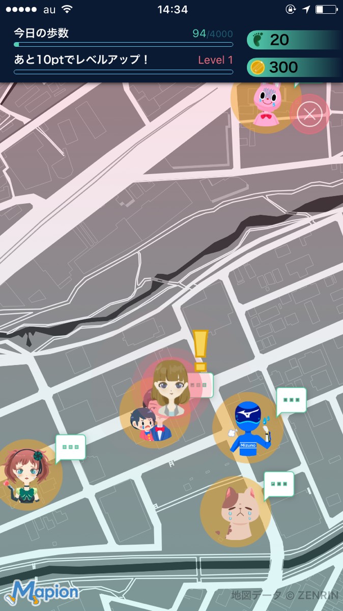 ・スマホを持って歩いてみましょう。地図上にいるいろいろなキャラクターから、様々な依頼が届きます。ビックリマークが出たら、タップしてみて下さい。