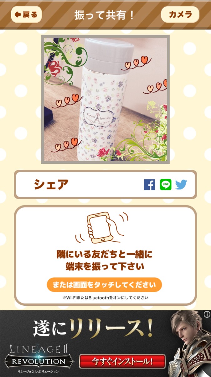 加工した写真は友達とシェアすることができます。シェアの仕方も面白く、そばにいる人と一緒に携帯を振れば、楽しく簡単にシェアができます。