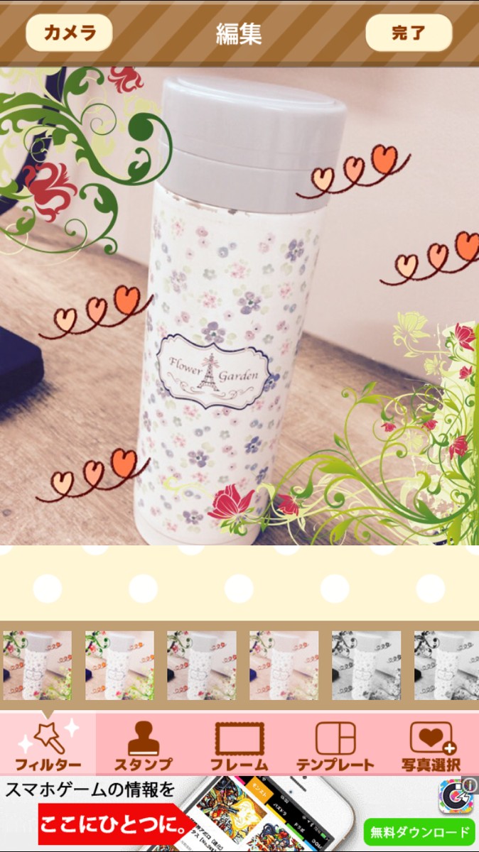 連写機能で撮った写真から選択した一番いい写真をさらに可愛く加工することができます。カメラロールの写真の加工も可能です。スタンプやフレームも可愛いのが揃っているので、加工も楽しくできます。