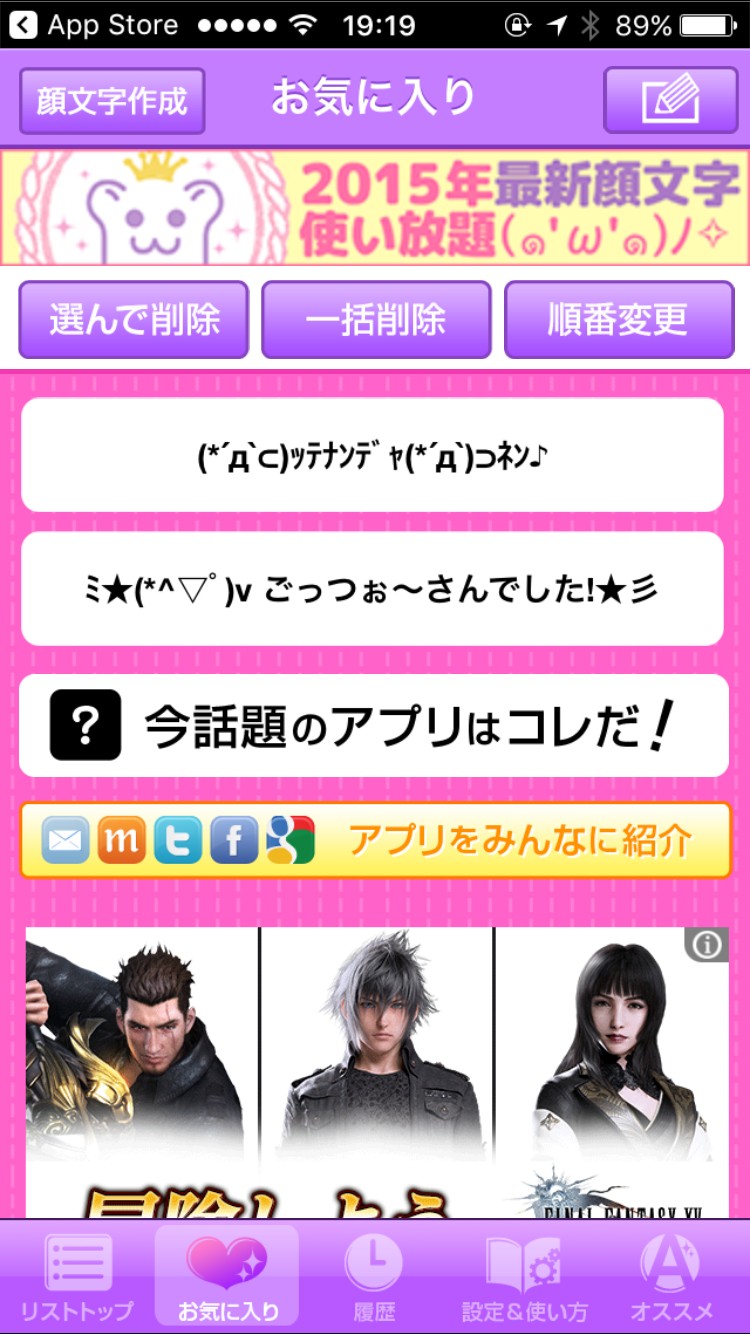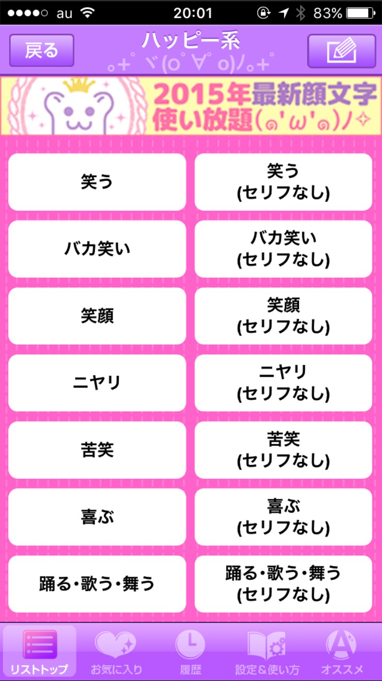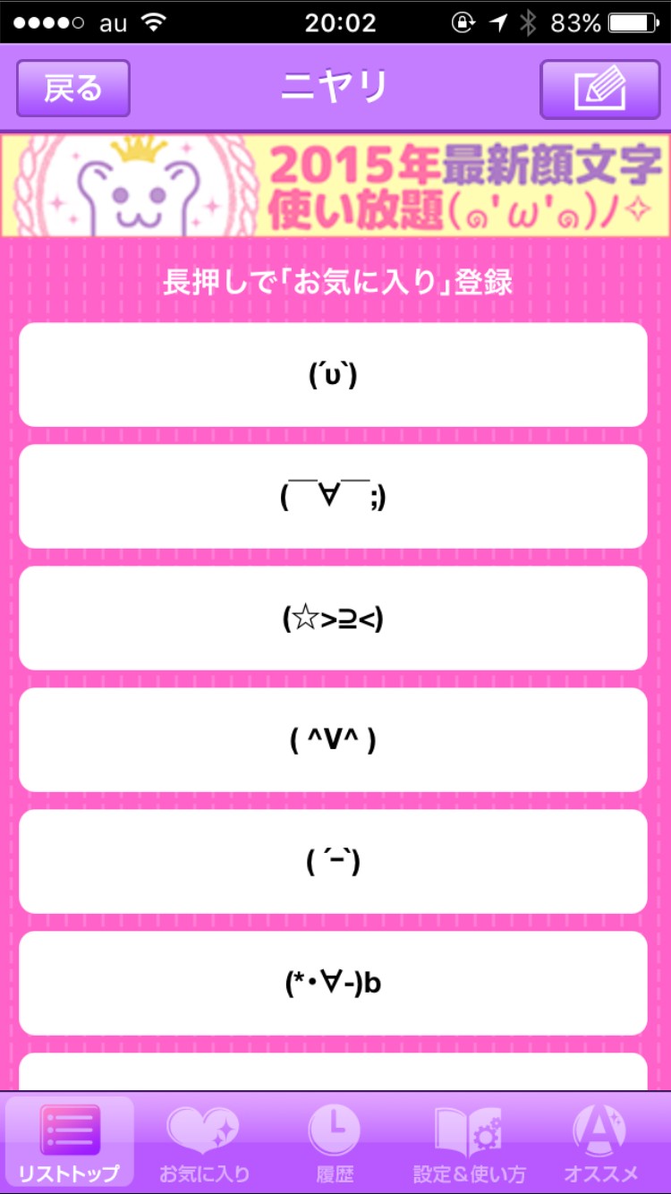 そして、履歴という項目もあり、今まで使った顔文字を表示してくれます。