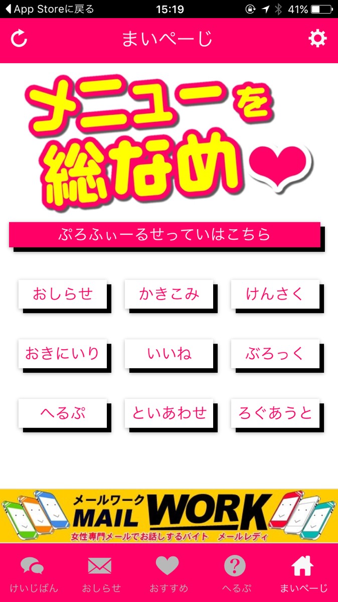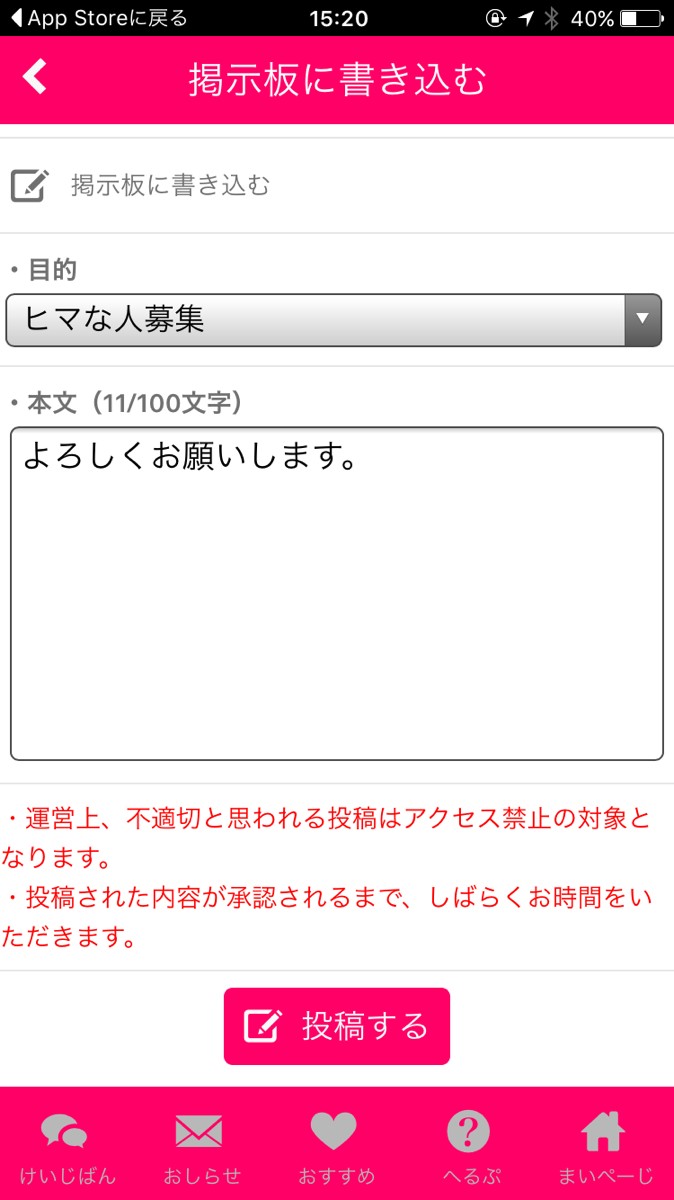 下のメニューバーより「まいぺーじ」を選択し、「かきこみ」ボタンを押してみましょう。まずは「ヒマな人募集」「遊び友達募集」など用意されている項目から目的を選びます。その下に100文字以内の本文を書き「投稿する」ボタンを押すだけです。