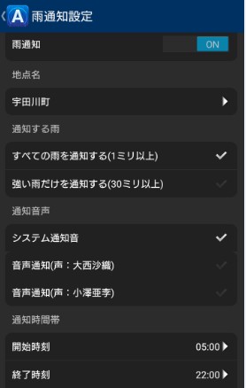 降雨アラートの通知は、声優の大西沙織さんや小澤亜李さんの声で届けてくれます。