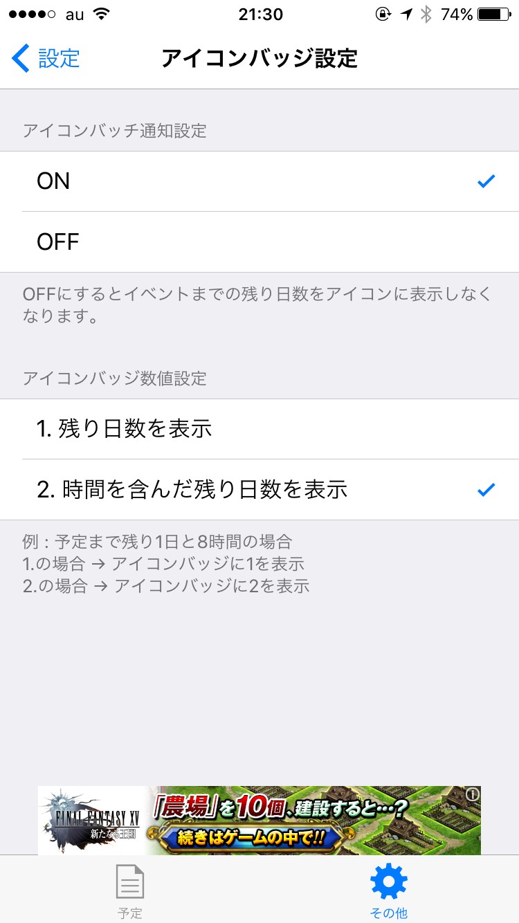 アイコンバッチの設定では、イベントまでの残り日数をカウントダウンするかしないかを選ぶことができます。