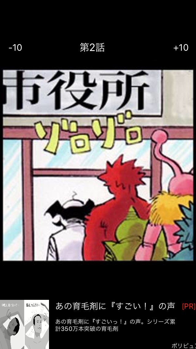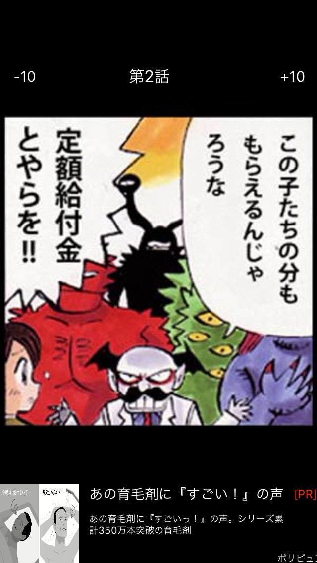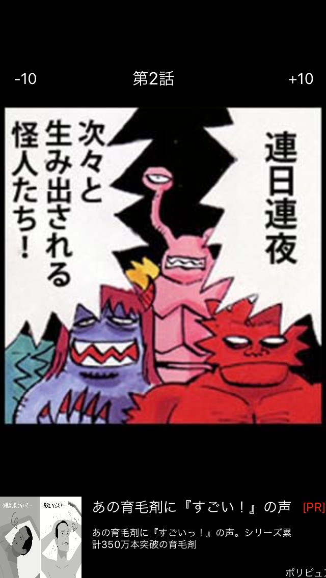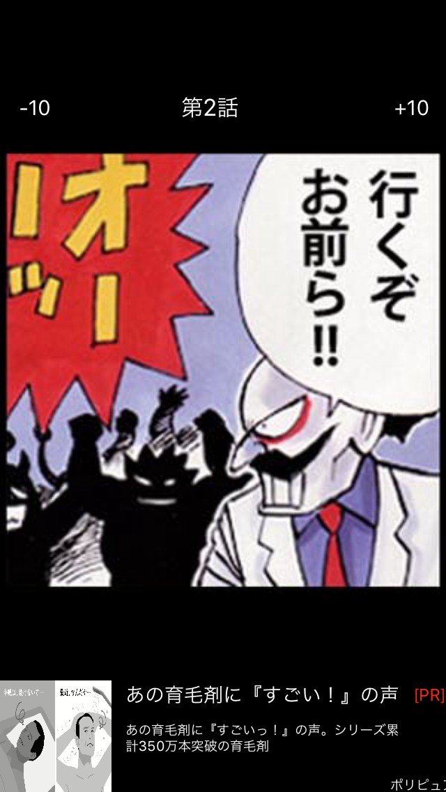 画面を上下にスワイプするとコマを進め、左右にスワイプするとページが移動します。上部の「-10」「+10」をタップすると10ページずつのページ移動が可能です。