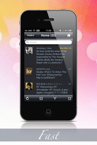 未読件数がわかるバッジや寝転がっても画面を固定させることができる機能、好きな音楽・ボイス・ビデオ(3GSのみ)をツイートできる機能……など、たくさんの便利な機能があなたのTwitterをもっと便利に、使うのが楽しくなりますよ。ホーム画面ではアイコンを選ぶことで、それぞれの機能を使うことができるため、使いこなせないという心配も不要です。