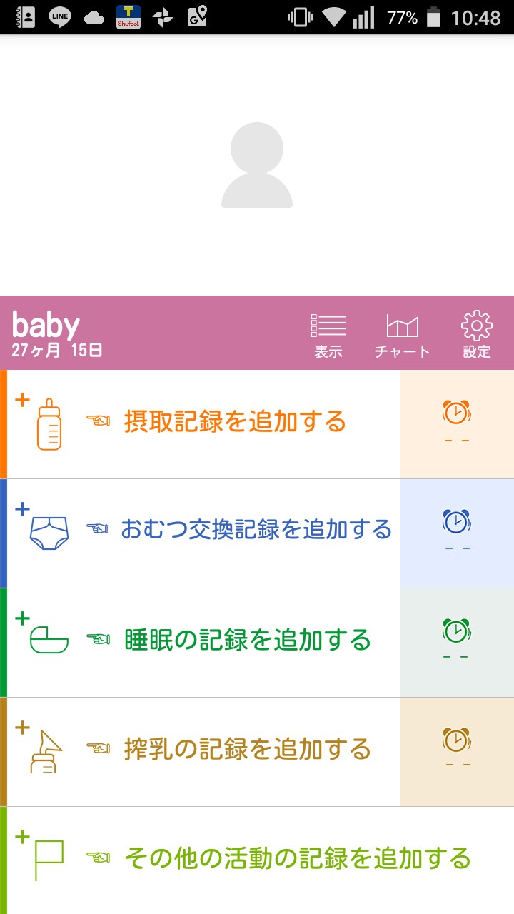 ミルクや母乳の摂取記録、おむつ交換記録、睡眠記録、搾乳記録とその他活動記録の5項目に分けられており、活動記録以外にはそれぞれアラームも付いています。