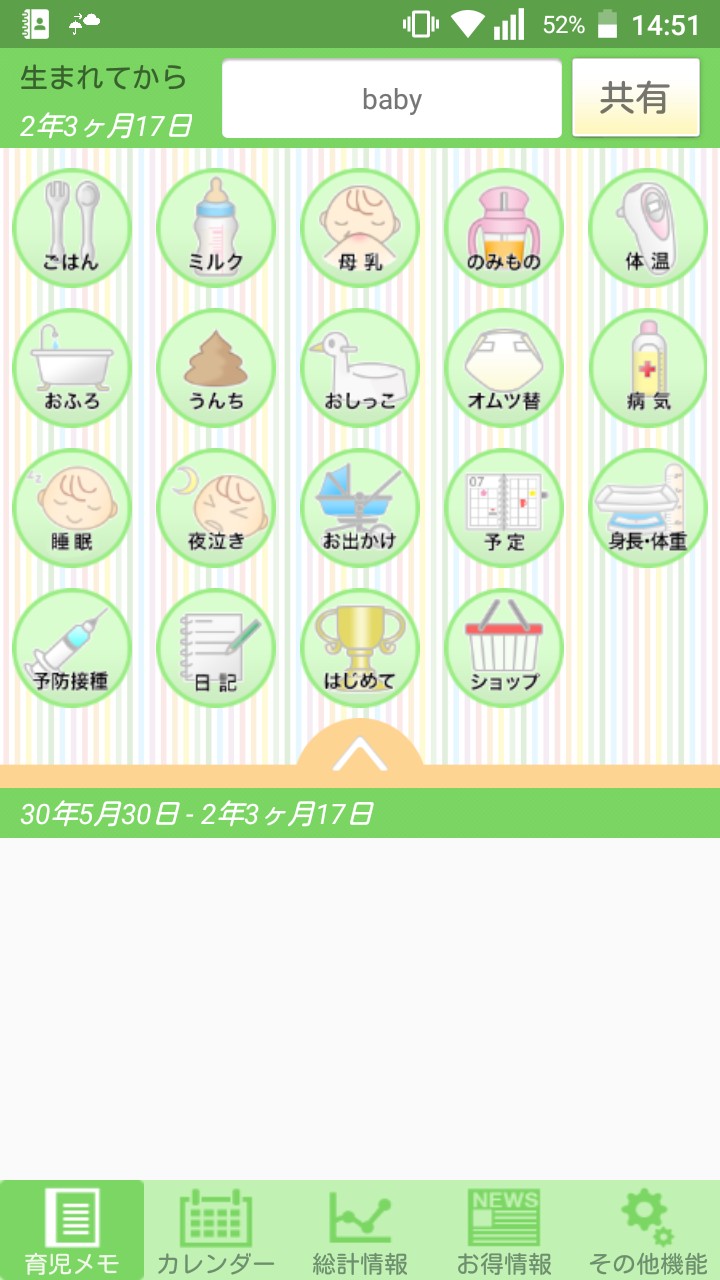 のみものやオムツ替といった基本的な事はもちろん、お風呂や夜泣き、体温なども記録できます。うんちの記録は色や形、量を選択式で記録しておけます。