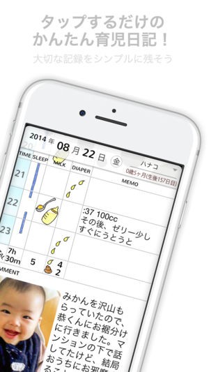毎日の育児記録を手軽につけて、可愛い子どもの成長を追いかけましょう。