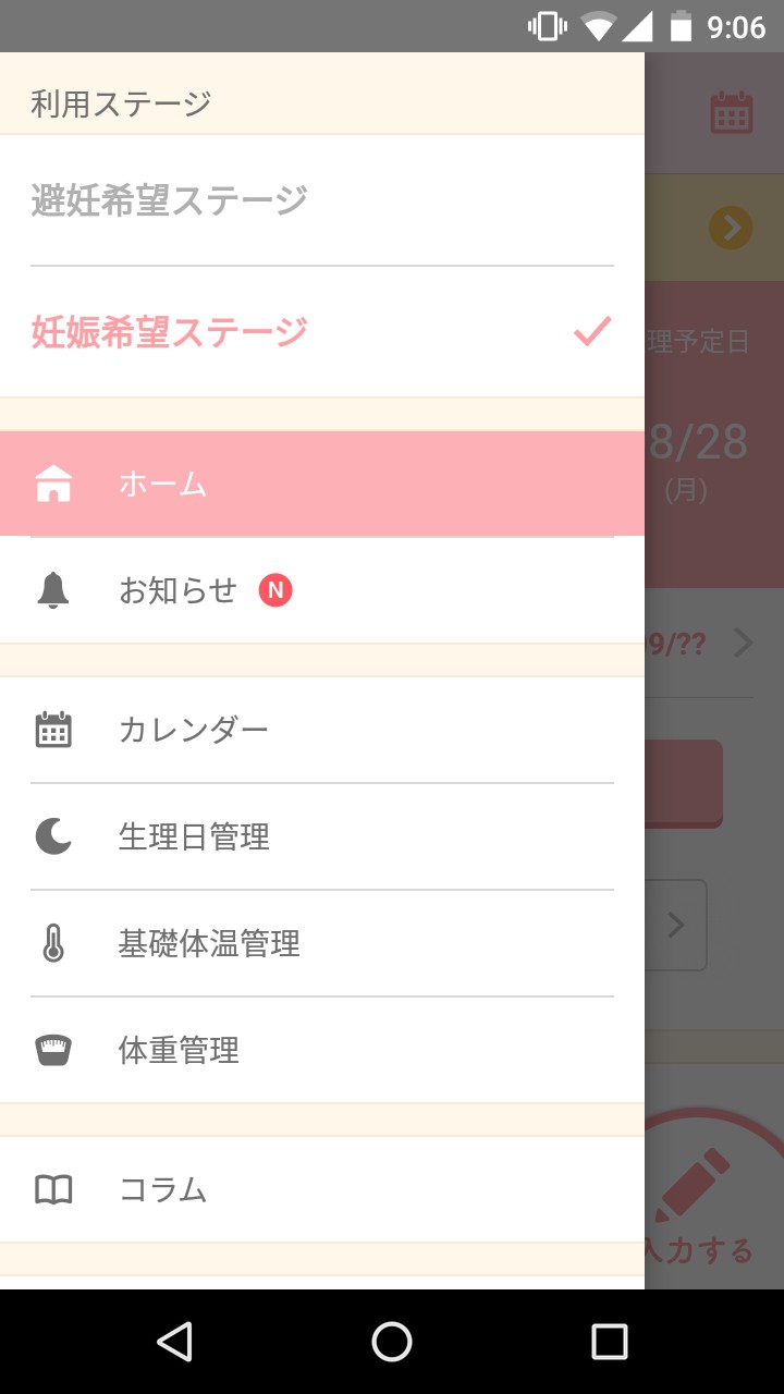アプリのホーム画面左上の3本バーアイコンをタップし、出てくる一覧の利用ステージを選択します。選べるのは、避妊希望ステージまたは妊娠希望ステージのどちらかです。