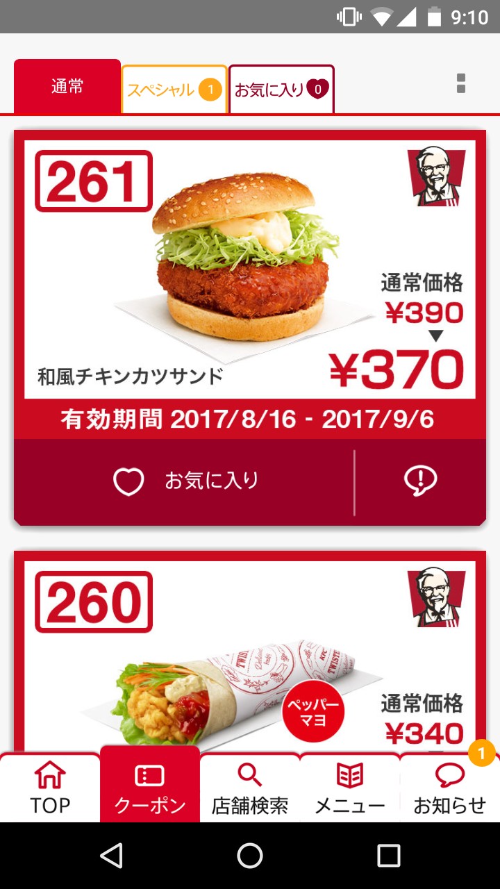通常クーポンと、アプリ限定のスペシャルクーポンがあります。気になるメニューはお気に入り登録しておくと、次回探す手間が省けるでしょう。