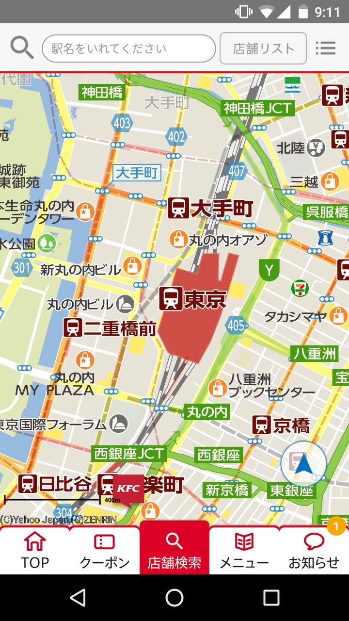 端末のGPS機能をオンにすると、近隣の店舗を検索して、ナビしてくれます。