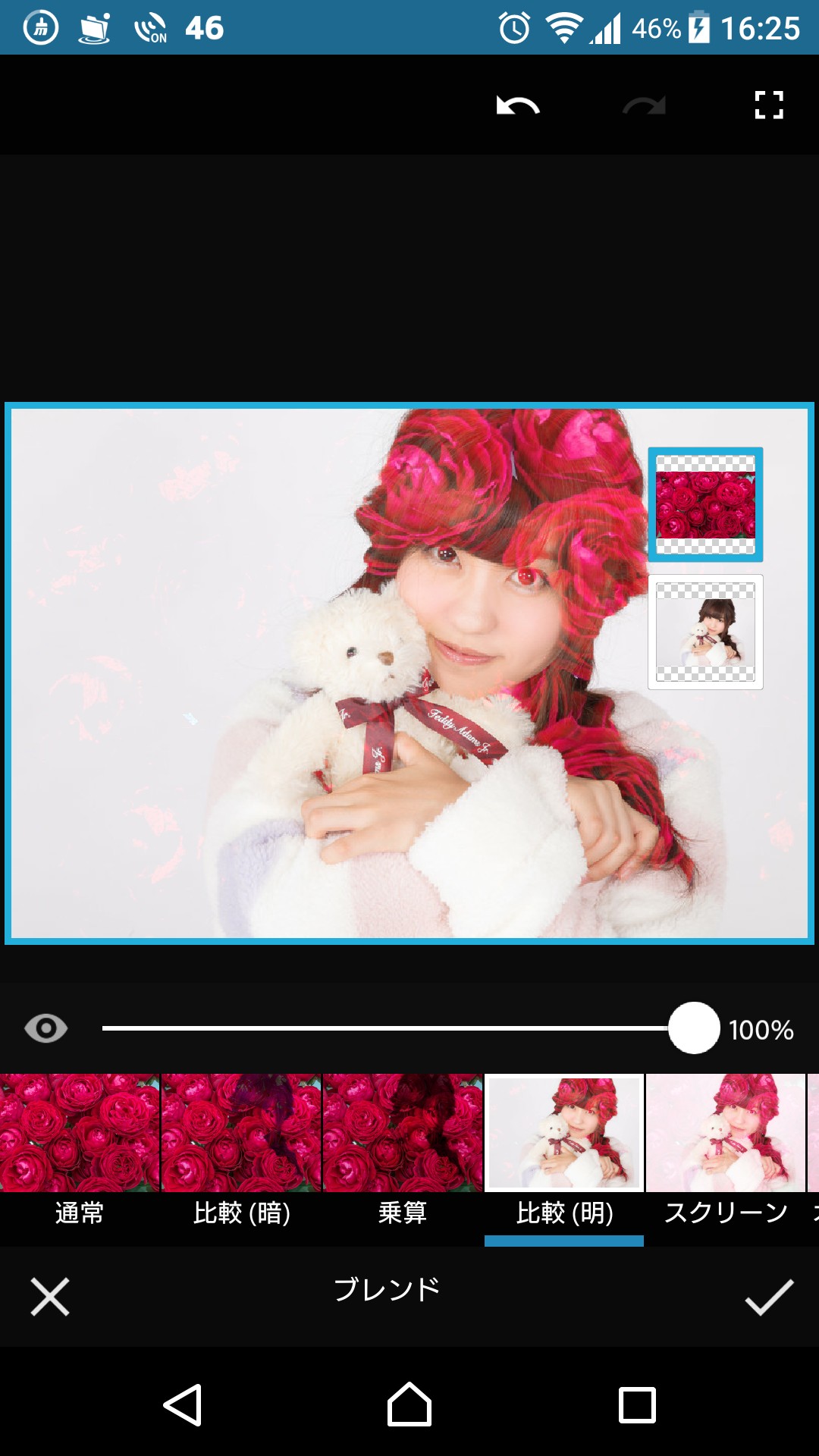 名前の通り複数の画像をミックスさせ、一枚の写真を作ることができるアプリです。メインで使いたい写真を選択したら、画像右側の「+」アイコンをタップして、合成する画像を複数枚選択しましょう。画像は最大5枚まで使用可能です。選択した画像はそれぞれ独立したレイヤーに分けられます。ただ画像を選んだだけの状態では、後から選んだ方の写真が表示され、下のレイヤーの画像は見えなくなっていますが、「ブレンド」をタップすることでさまざまな合成モードを使うことができます。また、上になっている画像の不要な部分を消すことにより、その場所が透明になり、下のレイヤーが見えるようになります。レイヤーごとに編集やフィルター処理ができるので、モノクロに加工した写真の上にカラー画像を配置する、といった、レイヤーの機能を最大限活かした加工もとても簡単にできます。