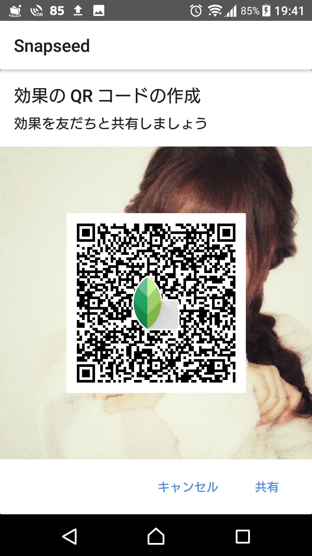 画像を調整する「効果」やホワイトバランスの調整機能、文字入れ、切り抜きなどの画像加工アプリとしての基本的な機能を一通り備えています。その他の大きな特徴としては、画像に対して行った処理を記憶して保存する機能が挙げられます。加工した写真の右上の、レイヤーが重なった絵のアイコンをタップすると、「効果をQRコード化」のメニューが表示されます。これをタップして「効果のQRコードを作成」を選択すると、効果の履歴をQRコード化して保存しておくことができます。これにより、たくさんの写真に同じ編集をしたい場合に何度も処理を繰り返す必要がなくなりますし、加工方法を同じSnapspeedユーザーと共有することも可能です。もちろん、他のユーザーのQRコードを読み取って、自分のSnapseedで使うこともできます。良く使う編集の流れが決まっている場合や、狙ったとおりの加工が偶然実現できたけれど、多分自力では二度とできないというような場合など、また使いたい、覚えておきたい編集手順を保存しておきましょう。