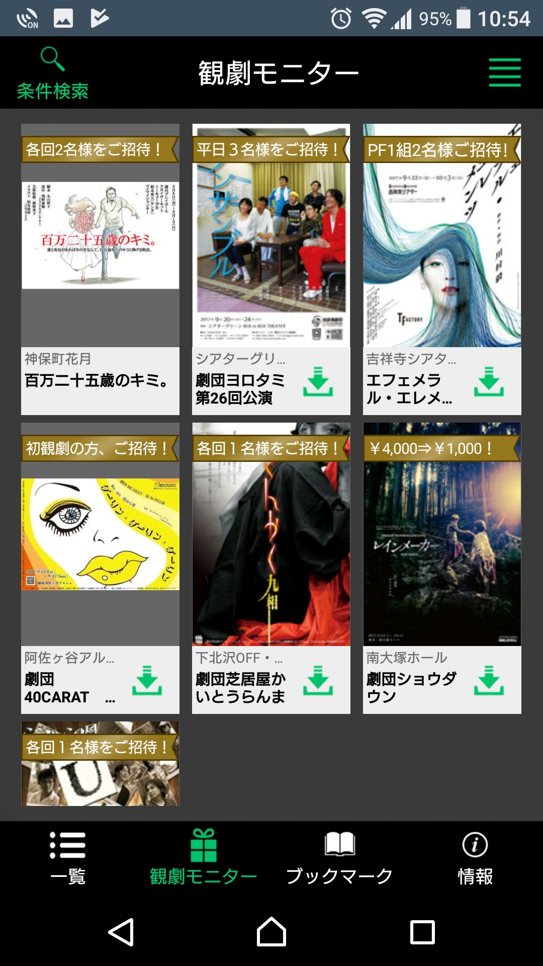 アプリトップ画面の下に、「観劇モニター」というアイテムがあります。ここをタップすることで、観劇モニターを募集している公演が表示されます。気になるチラシがあったら、タップして、「チケット応募」から申し込んでみましょう。運が良ければ、無料で観ることができるかもしれません!