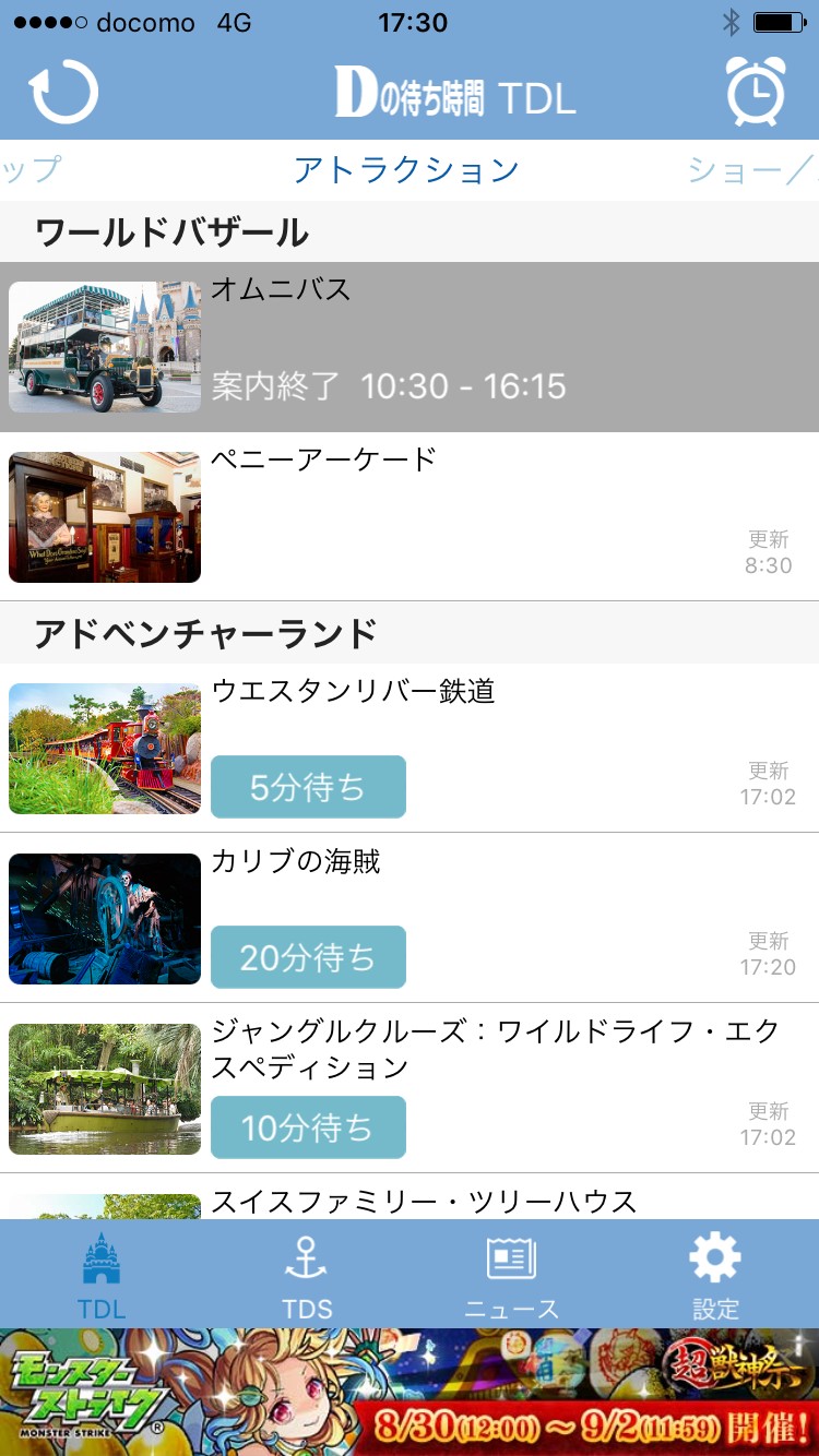 エリア別にアトラクションが表示されており、待ち時間がリアルタイムで確認できます。画面下部のボタンでTDL、TDSを切り替えることができます。